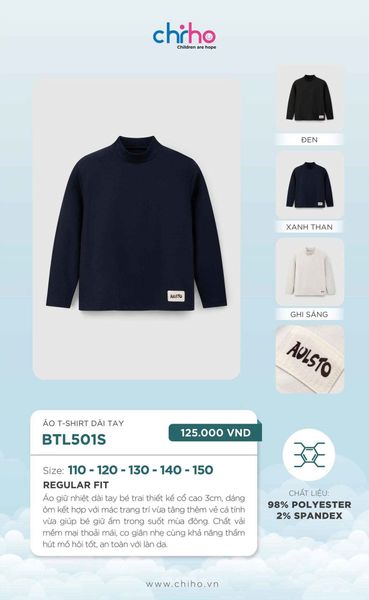 - Áo giữ nhiệt dài tay bé trai thiết kế cổ cao 3cm, dáng ôm kết hợp với mác trang trí vừa tăng thêm vẻ cá tính vừa giúp bé giữ ấm trong suốt mùa đông. Chất vải mềm mại thoải mái, co giãn nhẹ cùng khả năng thấm hút mồ hôi tốt, an toàn với làn da.